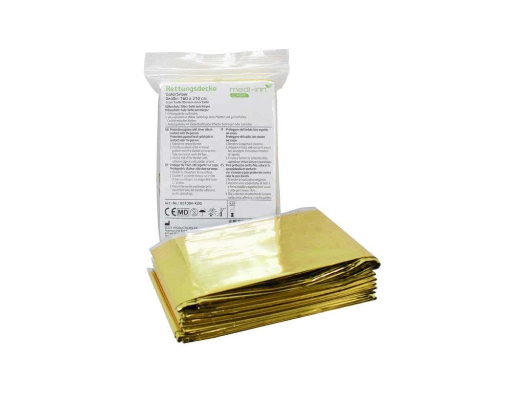 Izotermická záchranná deka Medi-Inn o rozměrech 160 × 210 cm poskytuje účinnou ochranu před podchlazením, přehřátím, větrem a vlhkostí. Je lehká, odolná a díky kompaktním rozměrům ve složeném stavu ideální pro každou lékárničku, batoh či auto.